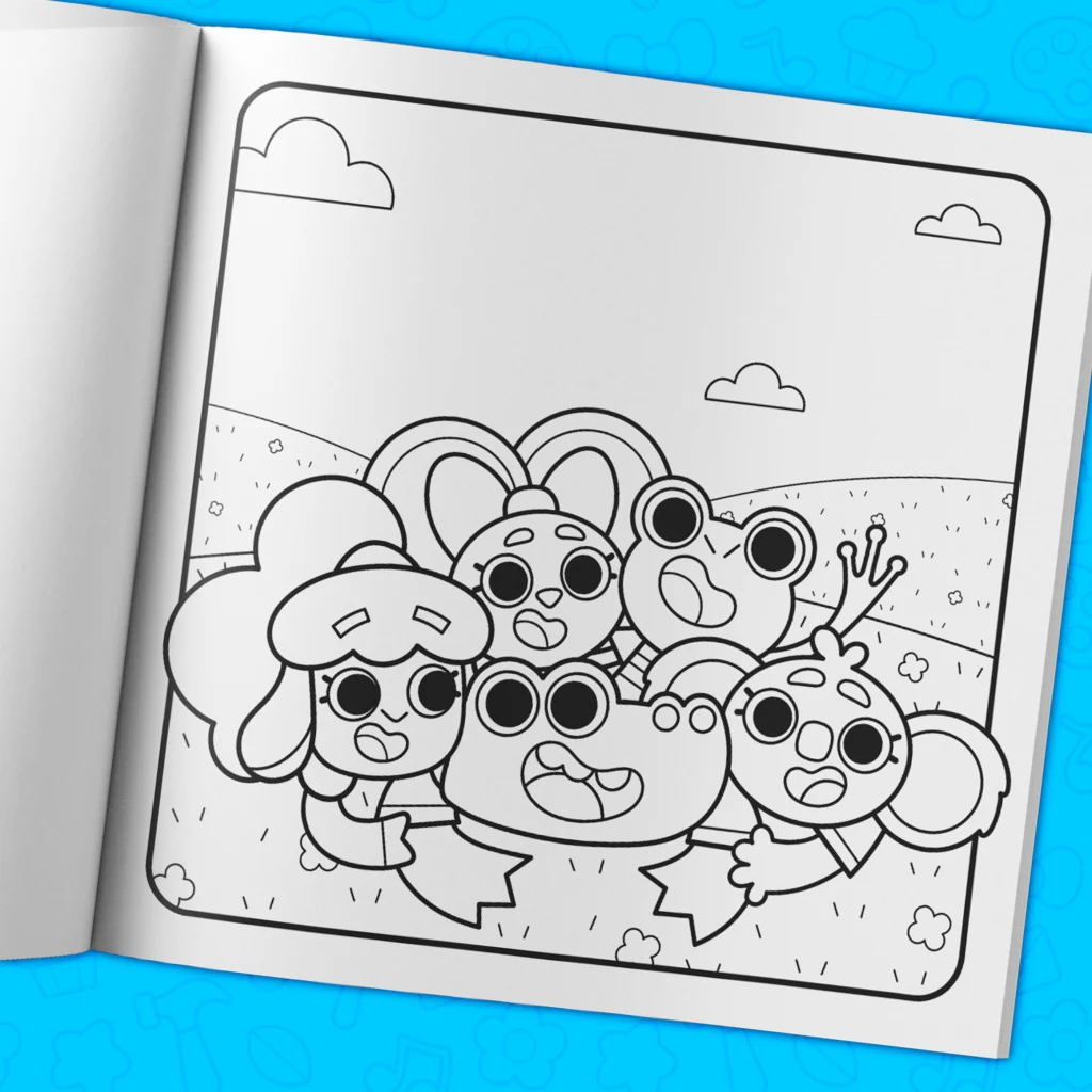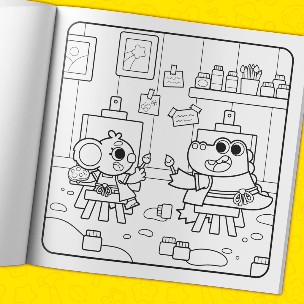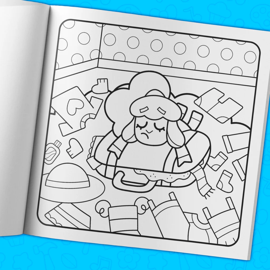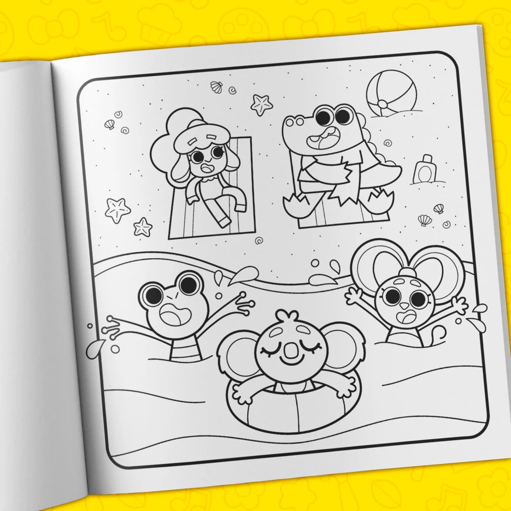 - Over 40 hand-drawn coloring pages filled with adorable characters.